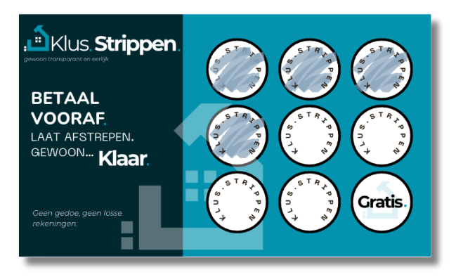Met onze UNIEKE strippenkaart bepaal jij zelf wanneer je een klus laat uitvoeren. Flexibel, voordelig en zonder gedoe. Zo heb je altijd iemand klaarstaan voor de klussen die je niet zelf kunt doen, precies wanneer het jou uitkomt.